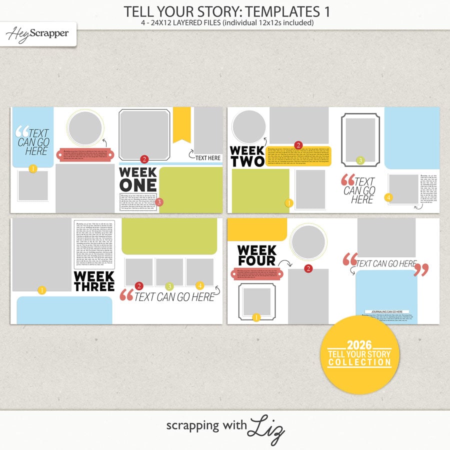 Tell Your Story will be my new double-page spread series for 2026. I’m designing these with a simple, magazine-style feel—perfect for using just photos and journaling or layering in as many fun digi products as you’d like. I’ll be using these to personally document my family’s year, and I can’t wait to start using them at the end of this week!